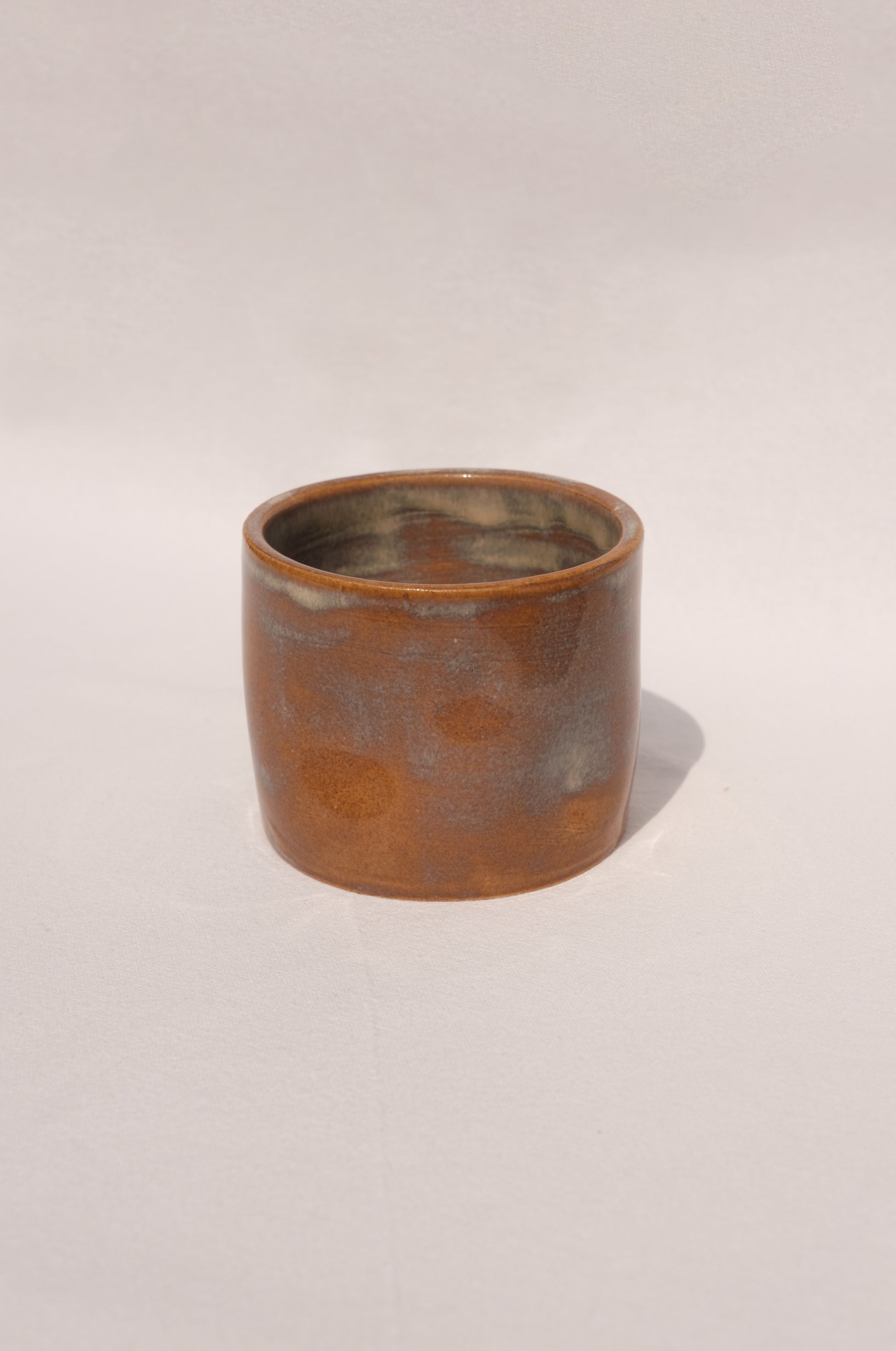 Cup with multiple dimples, featuring a warm brown base and a blue-lavender effect glaze. Wheel thrown, 100% painted by hand. Prices are for one piece.